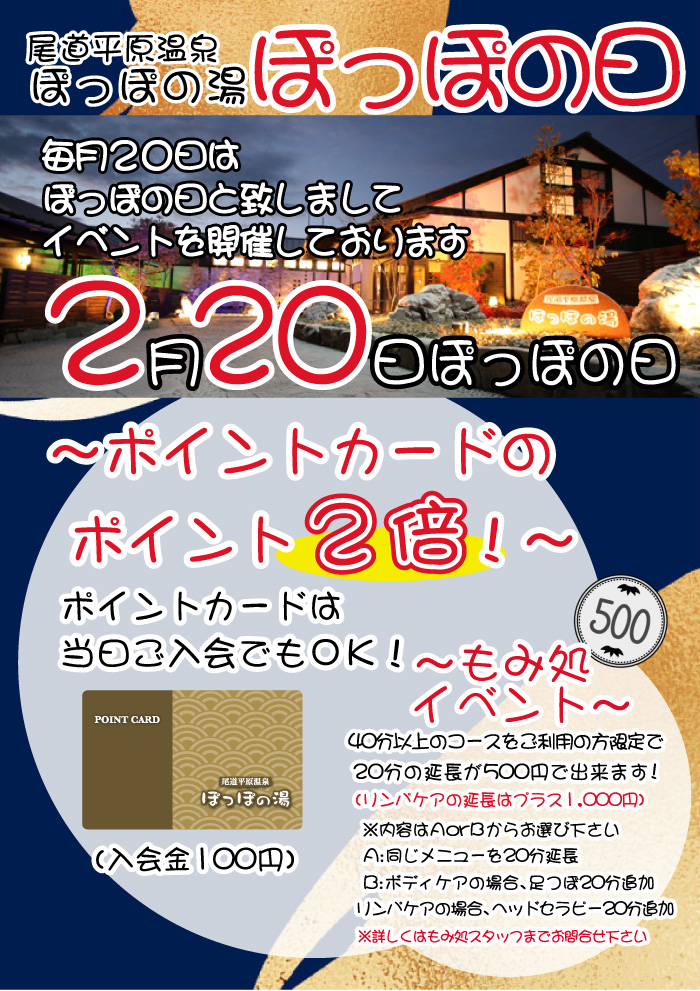 | 2月20日(金)の「ぽっぽの日」はポイント2倍! ポイントカードにつくポイントが2倍になります。 入浴回数券11枚綴りのご購入をご検討のお客様は「入浴回数券得々販売」も実施中ですので、入浴回数券11枚綴り1冊ご購入で入浴無料招待券が1枚ついてきます。 ポイント2倍とあわせてご検討くださいませ。 また、もみ処でもぽっぽの日イベント実施いたします。 皆様のご利用お待ちしております。 |