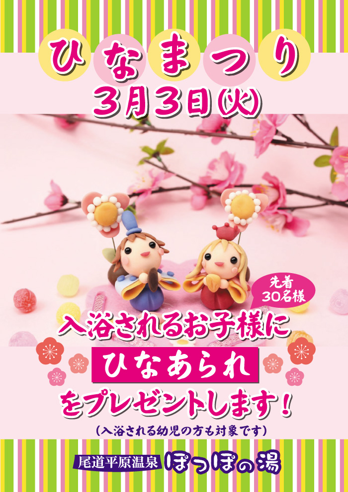 | 3月3日(火)は「ひなまつり」ですね ぽっぽの湯ではご入浴されるお子様にひなあられをプレゼントいたします。 先着30名様、無くなり次第終了です。 皆様のご来館お待ちしております。 |