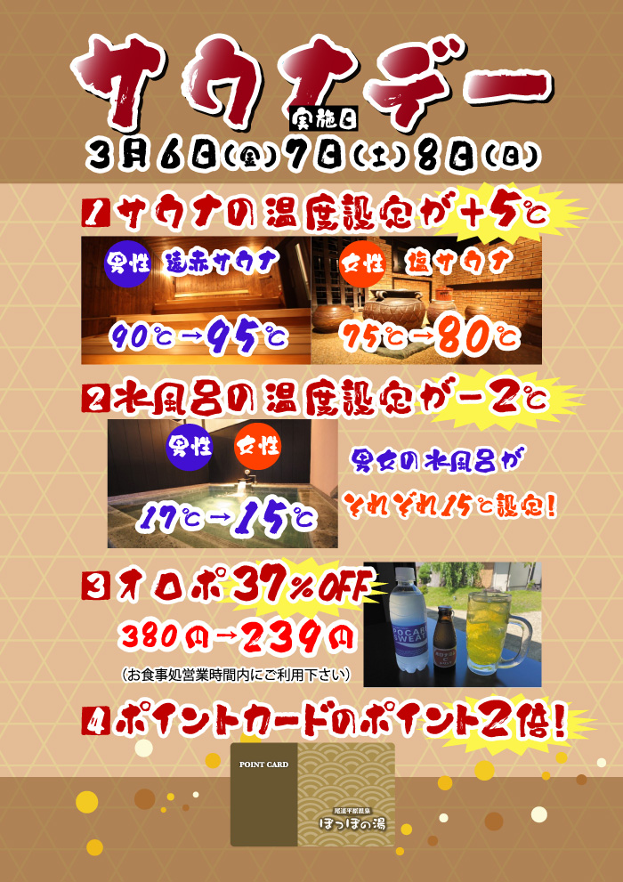 | 3月6日(金)7日(土)8日(日)の3日間は「サウナデー」 ①サウナ温度が+5℃ 男性遠赤サウナが90℃を95℃に女性塩サウナは75℃が80℃の設定にいたします。 ②水風呂温度-2℃ 男女水風呂の温度設定を17℃から15℃に設定いたします。 ③オロポ37%OFF お食事処で提供しているサウナー定番ドリンク「オロポ」を37%OFFの239円でお飲みいただけます。 ④ポイント2倍 ポイントカードにつくポイントが2倍になります。 ぜひ、いつもと違うサウナ環境でととのってみてはいかがでしょうか。 |