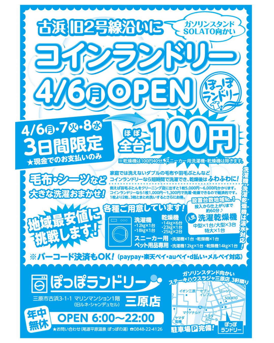 | ぽっぽランドリー三原店が近日中にOPENします!! 地域最安値を目指します!! 場所:マリンマンション1階 ステーキハウスラジャ三原店3件隣 ガソリンスタンド(ソラト)目の前 |